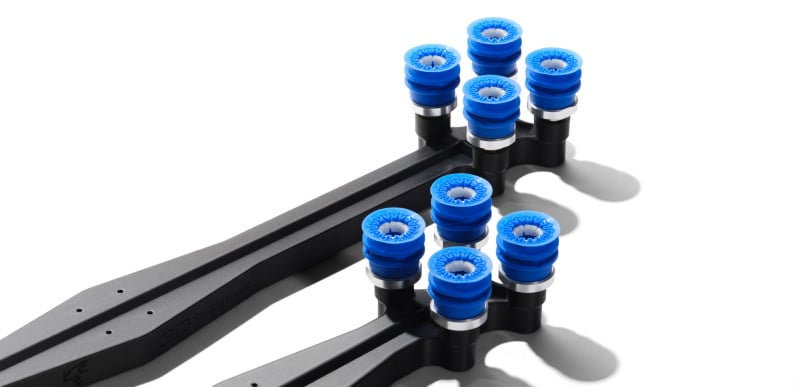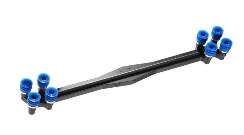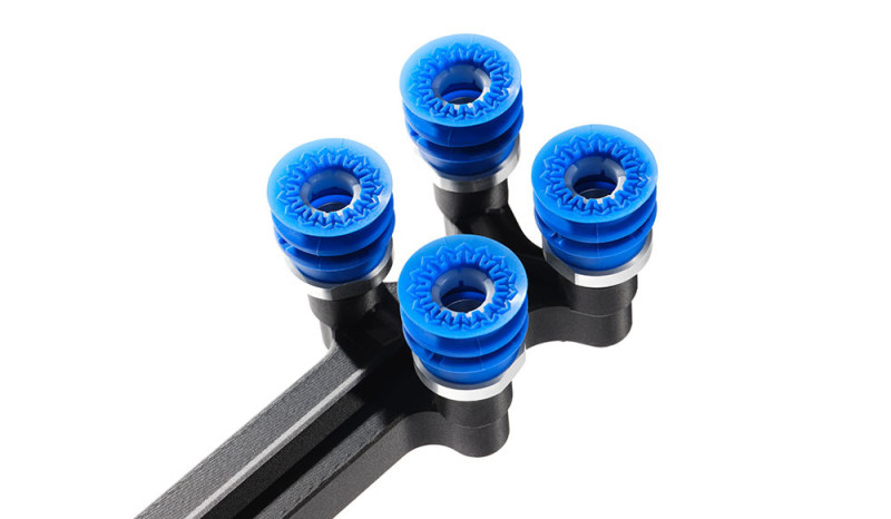 吸盘式夹爪用于生产线上最后的包装环节,可将单位容器运送到零售包装盒中。由于夹持点之间的距离取决于最新的产品和包装盒形状,通过以增材制造技术制作 EOAT,制造团队便能够根据最新要求即时调整夹爪长度,并且不会额外增加重量。在内部制造此零件,可以避免因等待供应商运送定制零件而造成的延误。因此,使用 Onyx 生产零件可以加快零件制造速度,降低总成本,同时减轻包装机器人的重量(从而降低负荷)。